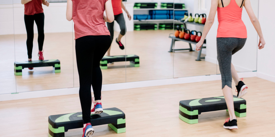 - Keeping your chest up and core engaged, quickly switch your feet so that your right foot is on the ground and your left toes are on the step, pumping your arms in sync.